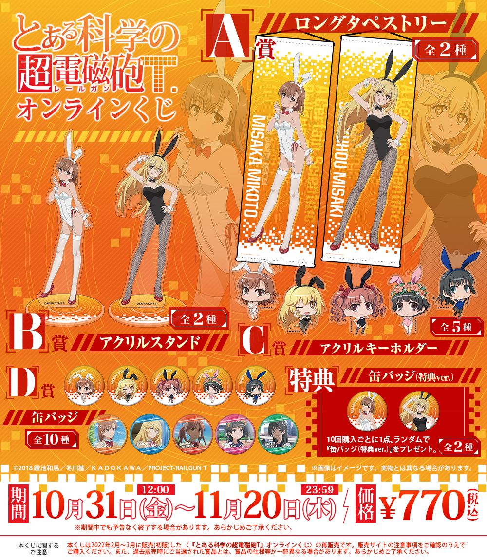TVアニメ『とある科学の超電磁砲T』のオリジナルグッズが当たるオンラインくじ。10回購入ごとに、全2種の缶バッジ(特典ver.)のどちらか1つをランダムでプレゼント。