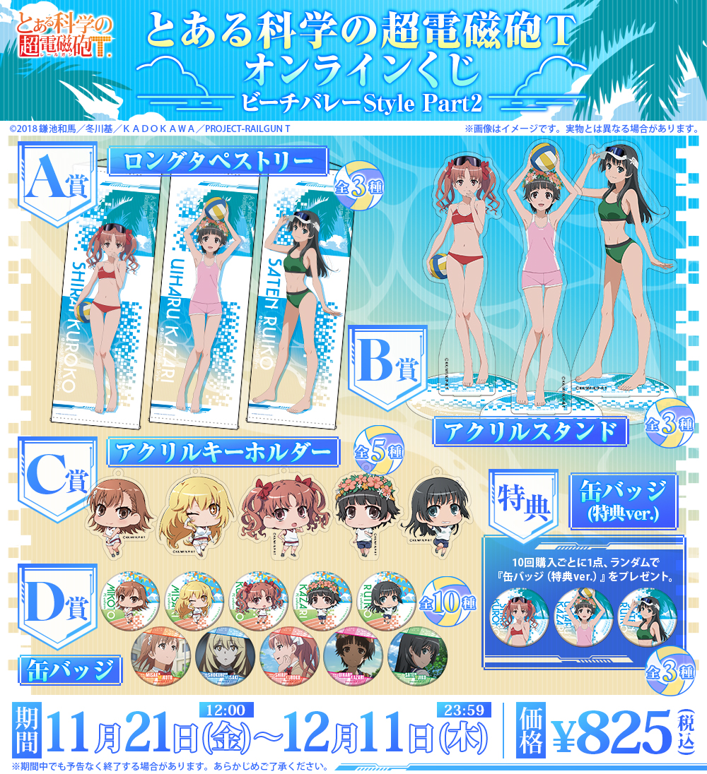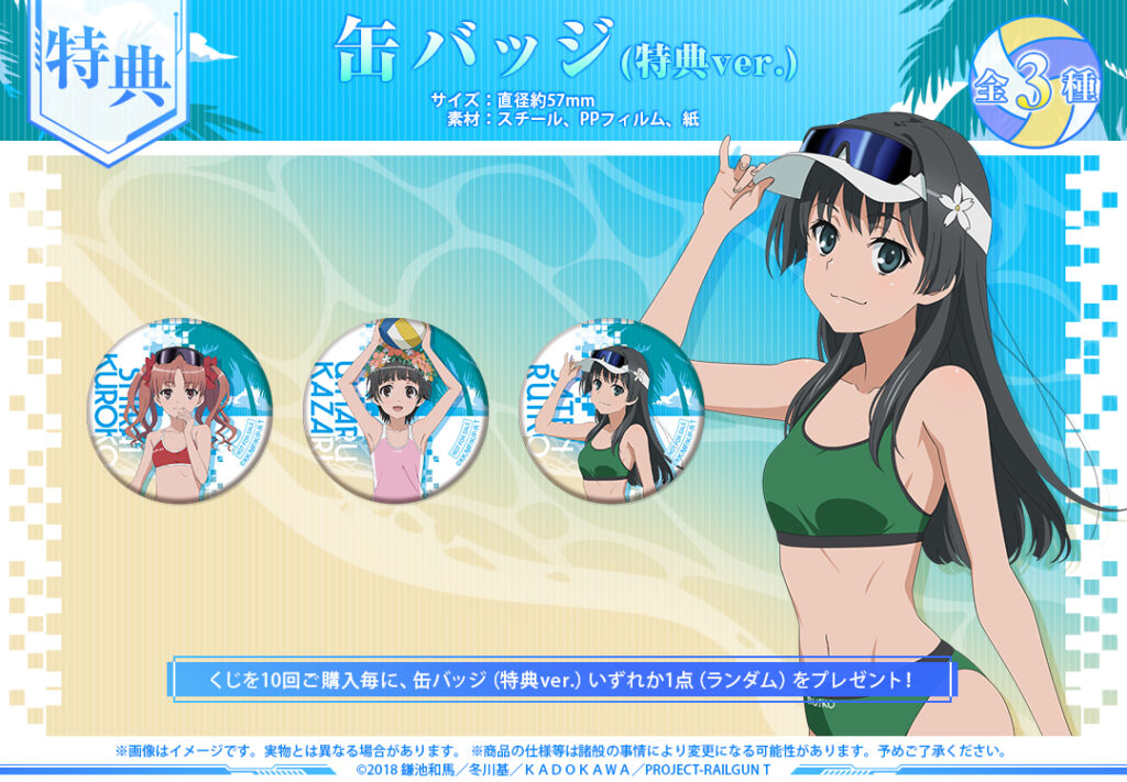 ビーチバレーをテーマとした、TVアニメ『とある科学の超電磁砲T』のオンラインくじ、2ヶ月連続リリースの第2弾。10回購入ごとに、全3種の缶バッジ(特典ver.)のいずれか1つをランダムでプレゼント。